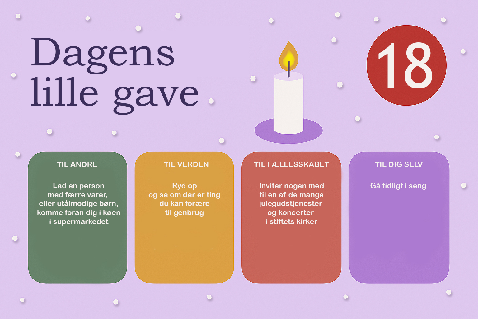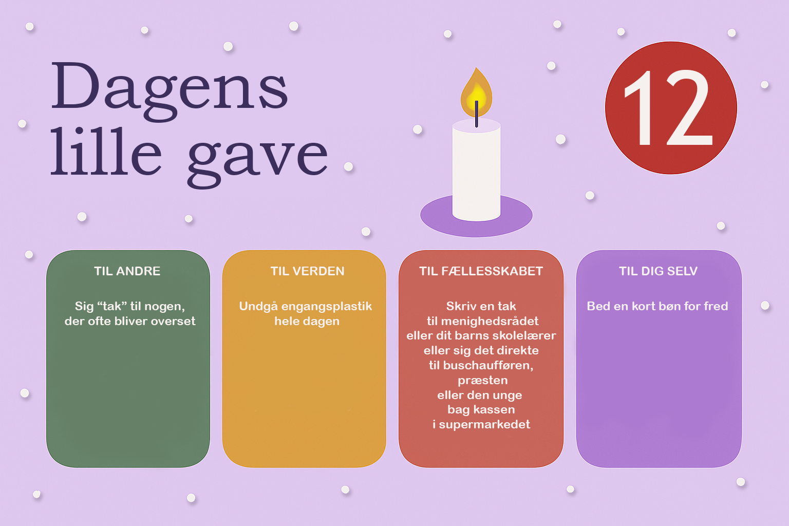 Hver dag i december bringer vi en lille opfordring – en gave, du kan give til andre, til verden, til fællesskabet eller til dig selv. Næstekærlighed begynder ikke i det store, men i det nære. I et smil, en tak, et øjebliks opmærksomhed. Håbet er, at vi sammen kan gøre december god for flere – én dag ad gangen.